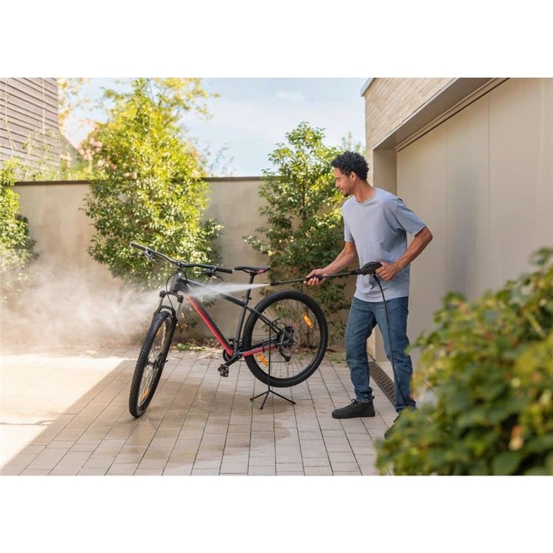 This practical high-pressure cleaner is designed for easy transport and mobility.