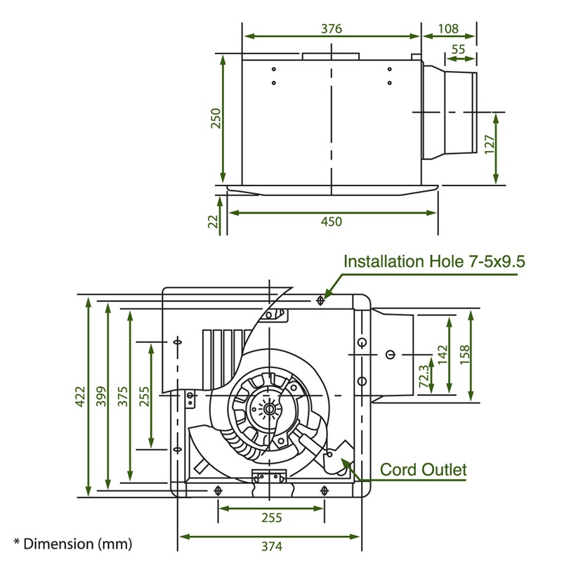 Air Volume CMH (CFM) Hi: 640 (377) Lo: 430 (253)
