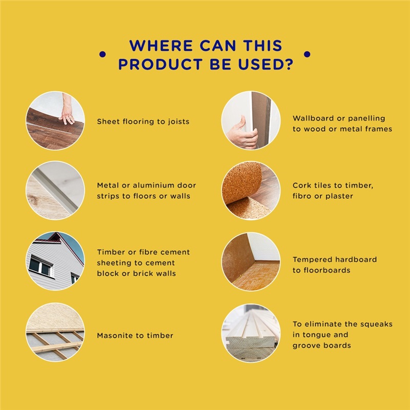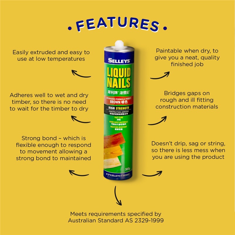 Selleys Liquid Nails is a high strength multipurpose construction adhesive that forms a strong and lasting bond on most building substrates.