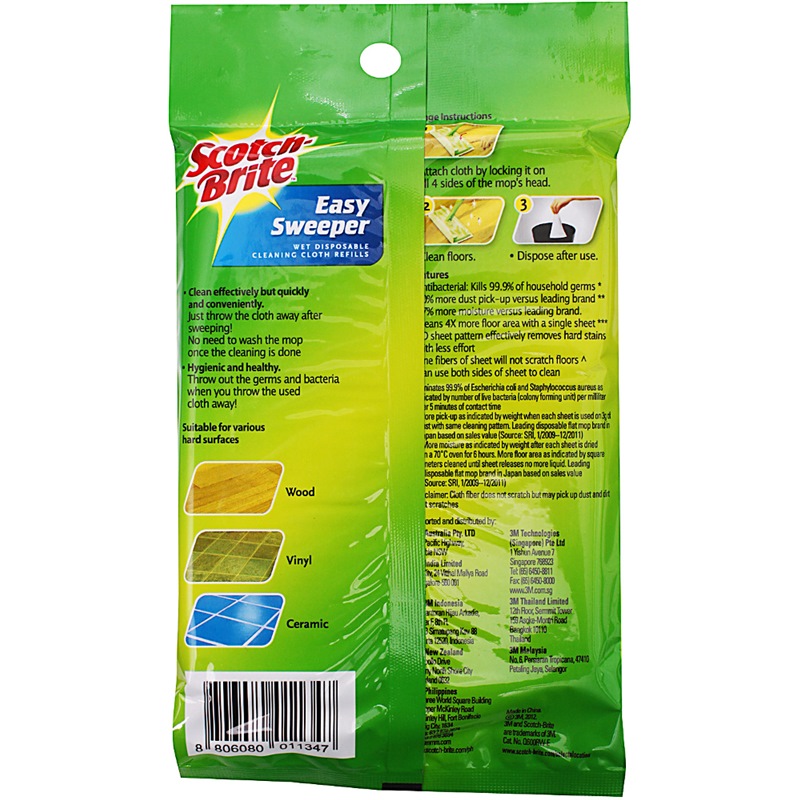 Scotch-Brite Easy Sweeper Wet Refill (8 sheets) cleans 4x more floor area compared to other branded wet wipes! Latest additon to the Scotch-Brite Floor Care family, the Easy Sweeper is effective, quick and convenient! The special weave electrostatic sheets attracts and holds dust, dirt, hair inside fibers so it won’t fall out once picked up.