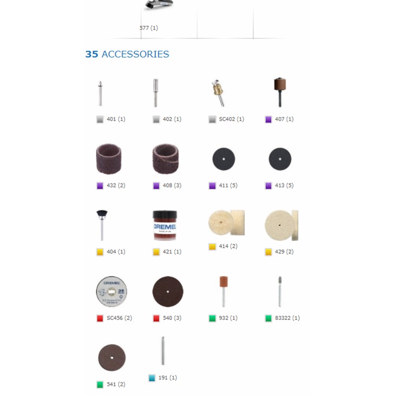 Next to this attachment the kit includes a 1-hour battery charger and 35 original Dremel accessories including EZ SpeedClic.