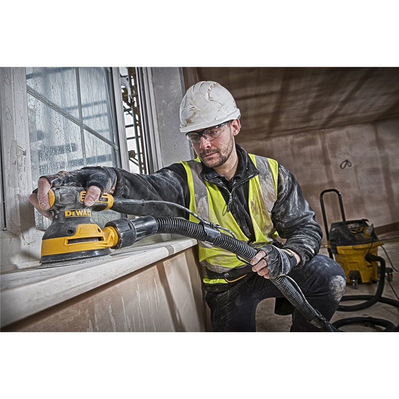 A low-profile design allows users to get closer to the worksurface and the one-handed locking dust bag attaches securely to the sander to aid in dust collection, or the user can attach the sander directly to the DWV010 or DWV012 dust collectors.