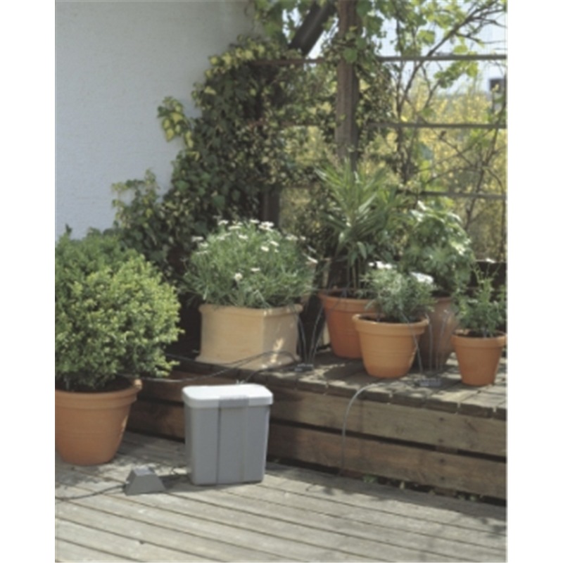 Fully sealed low voltage transformer (14 V) for indoor and outdoor use. Pipe pegs for fixing of up to 3 drip pipes per pot.