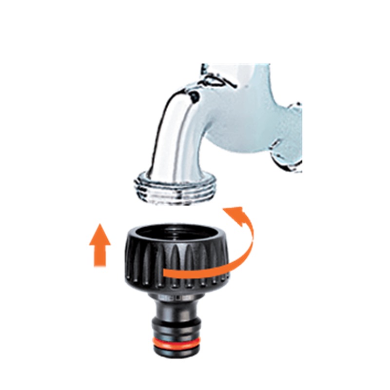 Connecting Quick-Click® system for 3/4 inch threaded taps by simply screwing on.