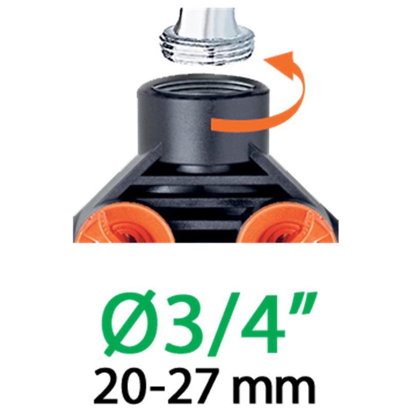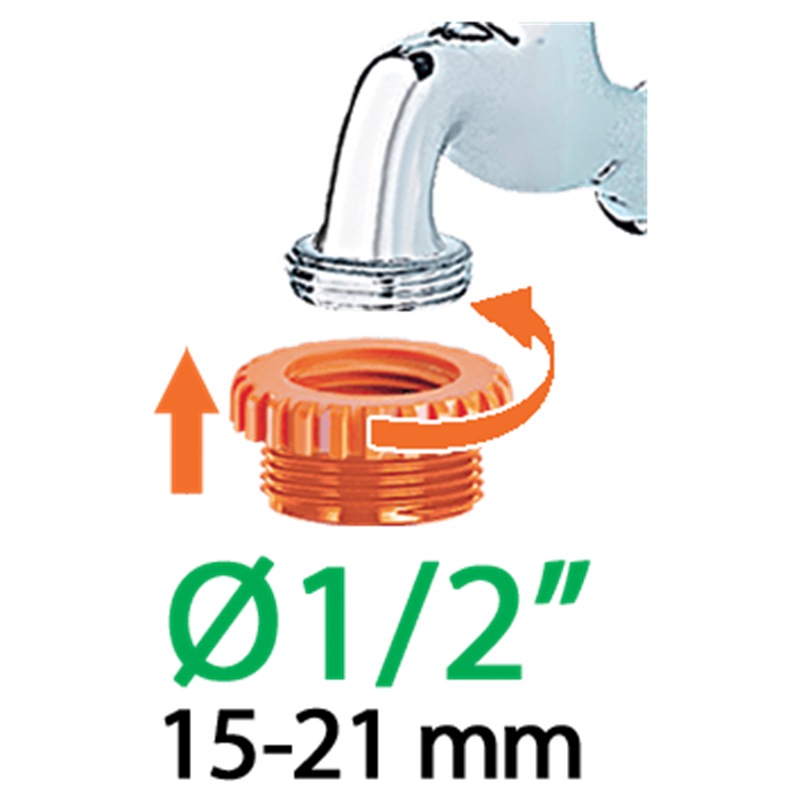 Screwed onto taps with 3/4 inch (20 - 27 mm) or 1/2 inch (15 - 21 mm) thread.