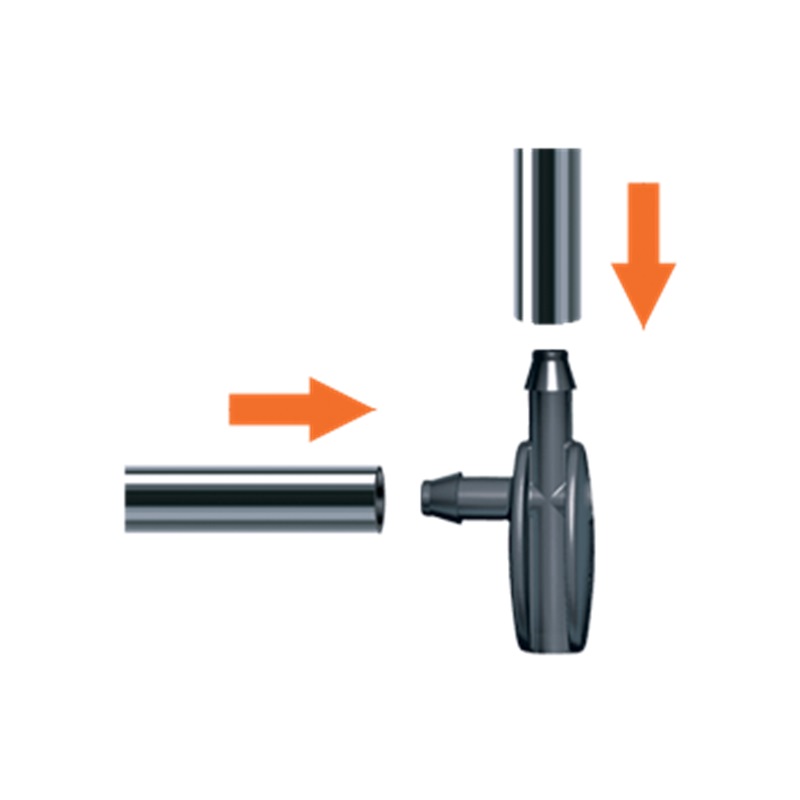 For connecting two pieces of 1/4 inch (4 - 6 mm) feeding hose at an angle.
