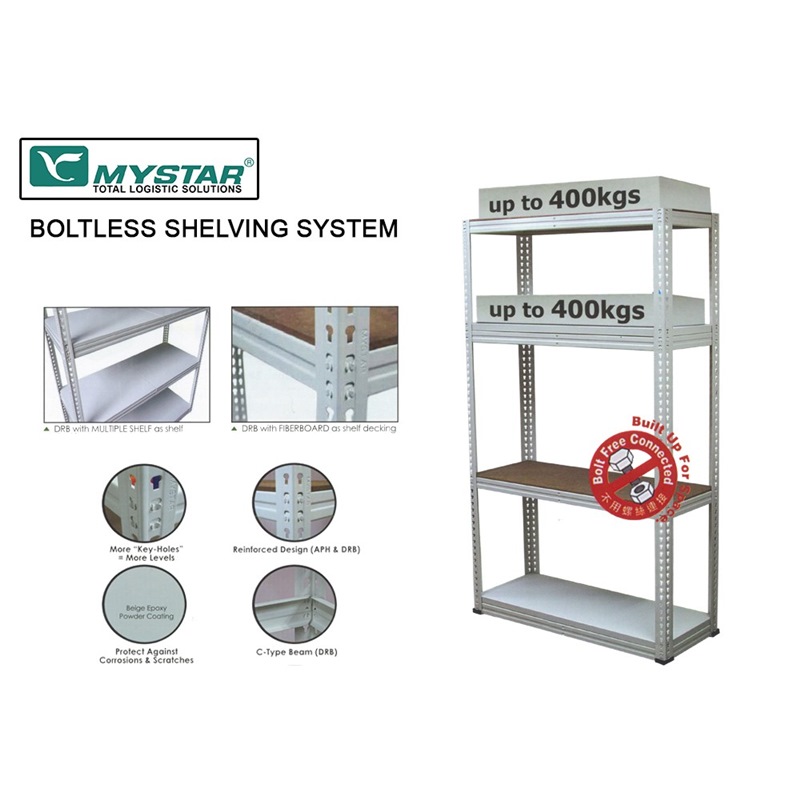 The "MYSTAR BS5000 Boltless Shelving" comes in the height of 1.80m and more with basic four shelves or optional to add more. The rack is designed so that the bottom and top shelf give you extra storage space while at the same time holding the rack firmly together. This rack will never wobble nor fall over. This boltless shelving rack was built with the user in mind.