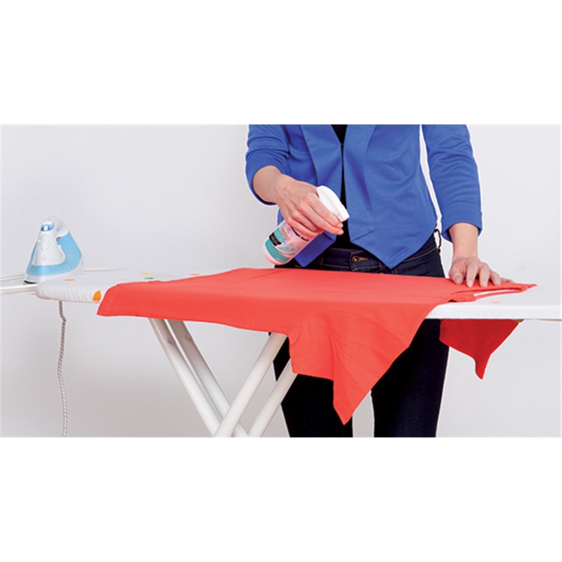 Spray about 20cm from the light textile and iron till the desired result has been achieved.