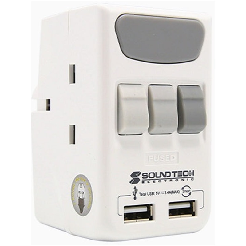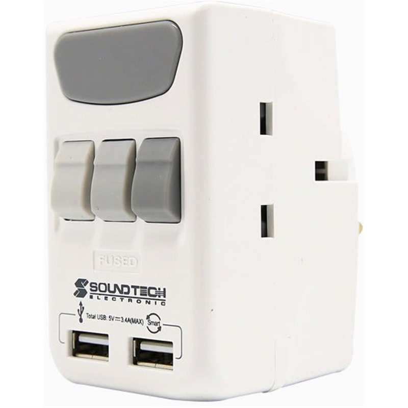 Home » Electrical & Lighting » Extension Cords & Travel Adaptors » SOUNDTECH 3 WAY ADAPTOR W/SMART 3.4A USB AND SWITCH PP-38U