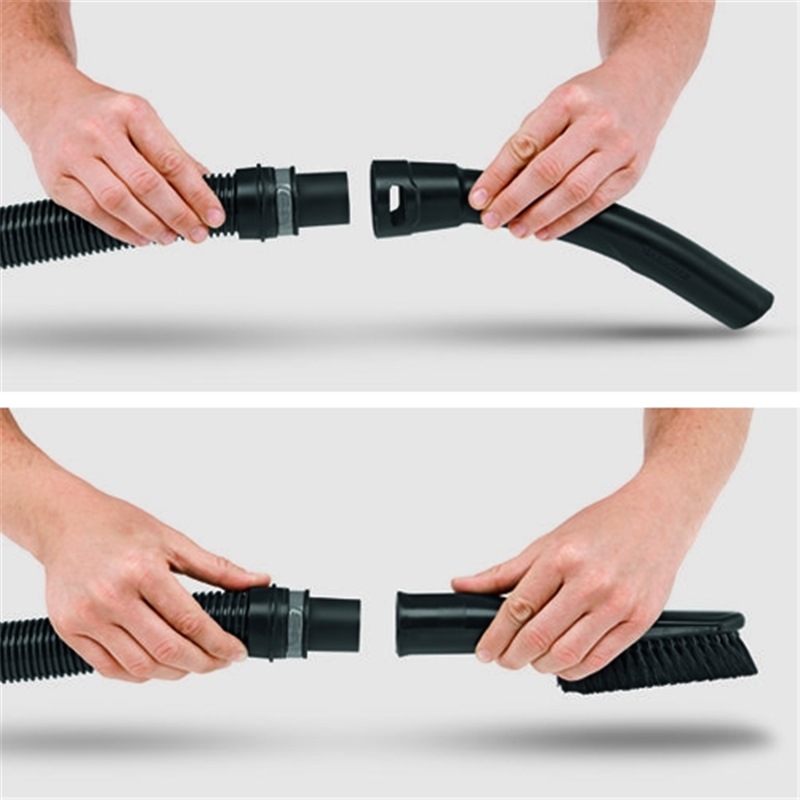 Space-saving, secure and easily accessible suction hose, power cable and accessory storage.
