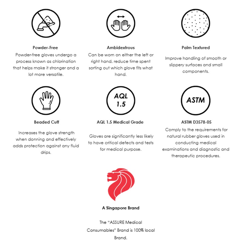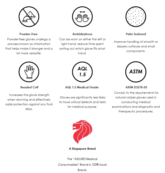 ASSURE Latex Gloves are manufactured in the highest required quality of AQL 1.5 Acceptable Quality Level (AQL), ambidextrous and perfect for examination purposes.