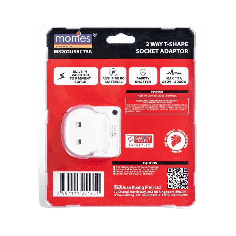 Home » Electrical & Lighting » Extension Cords & Travel Adaptors » MORRIES T-SHAPE 2WAY SOCKET ADAPTOR MS202USBCTSA (3.4A)