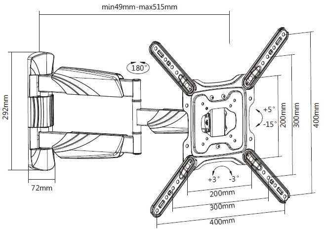 VESA 75x75; 100x100; 200x100, 200x200; 400x200; 300x300; 400x400