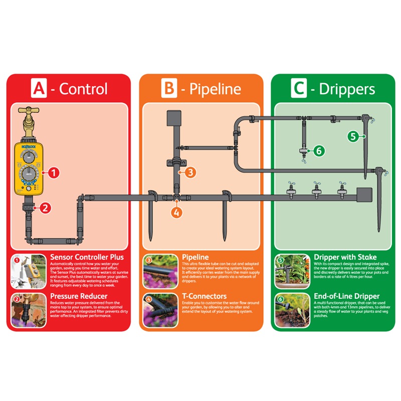 Includes the Sensor Plus Timer, which automatically waters at sunrise or sunset, the best time to water containers. Easy to set up simply select the watering duration and the frequency