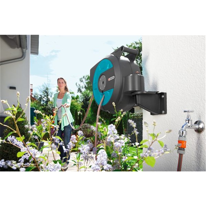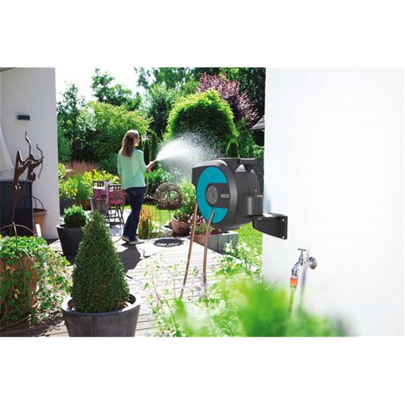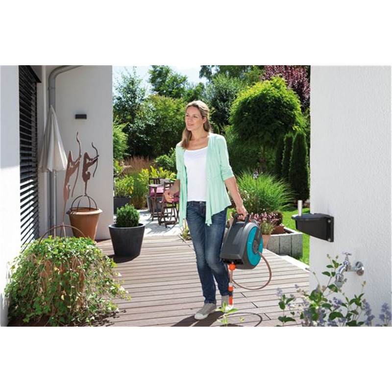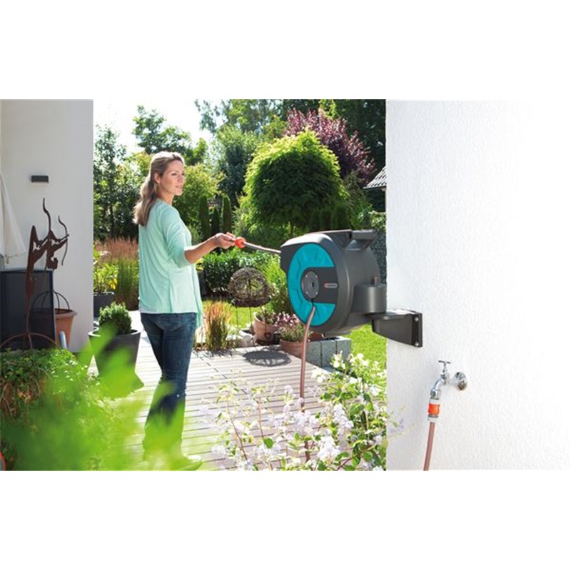 The GARDENA Comfort Wall-Mounted Hose Box 15 roll-up automatic makes watering especially easy and convenient.
